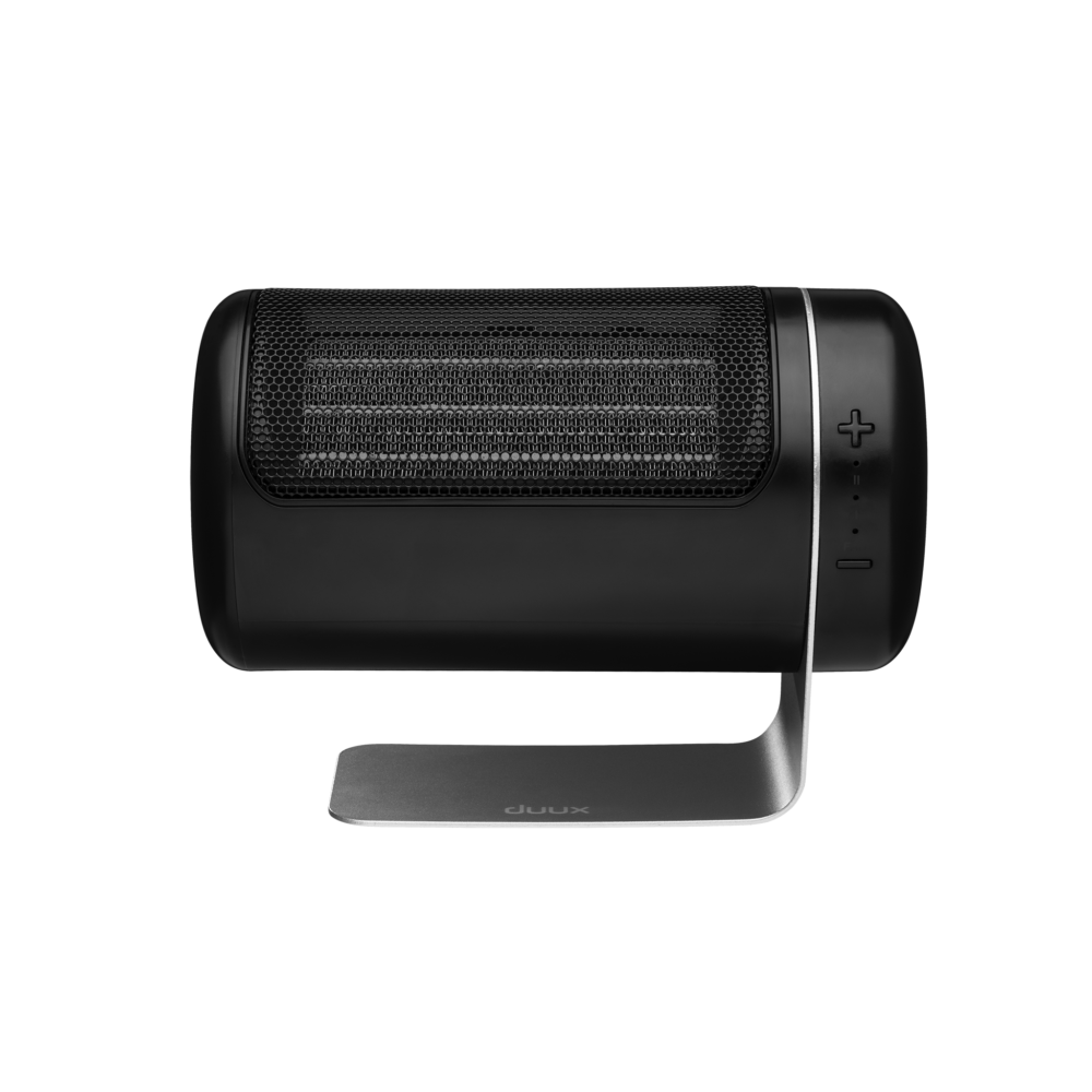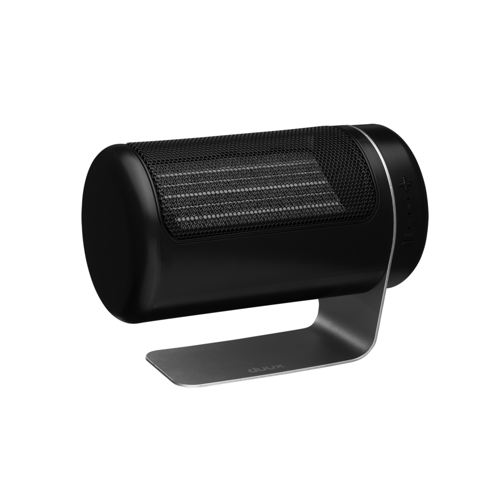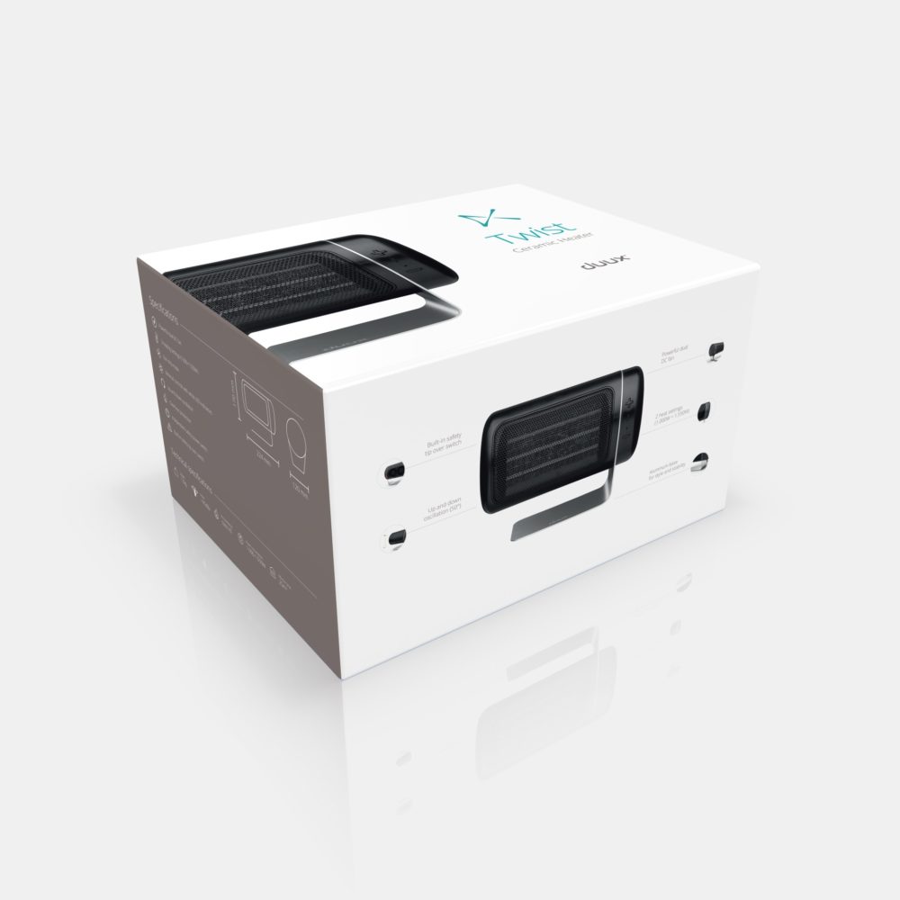 Met de dubbele DC-ventilator, naast elkaar geplaatst, is Twist keramische heater verrassend krachtig voor zijn compacte formaat. Door de verhoogde luchtstroom kan de warmte die door de keramische plaat wordt geproduceerd, verder in de ruimte worden verdeeld dan verwarming van vergelijkbare grootte met slechts één ventilator.