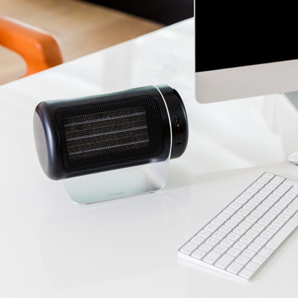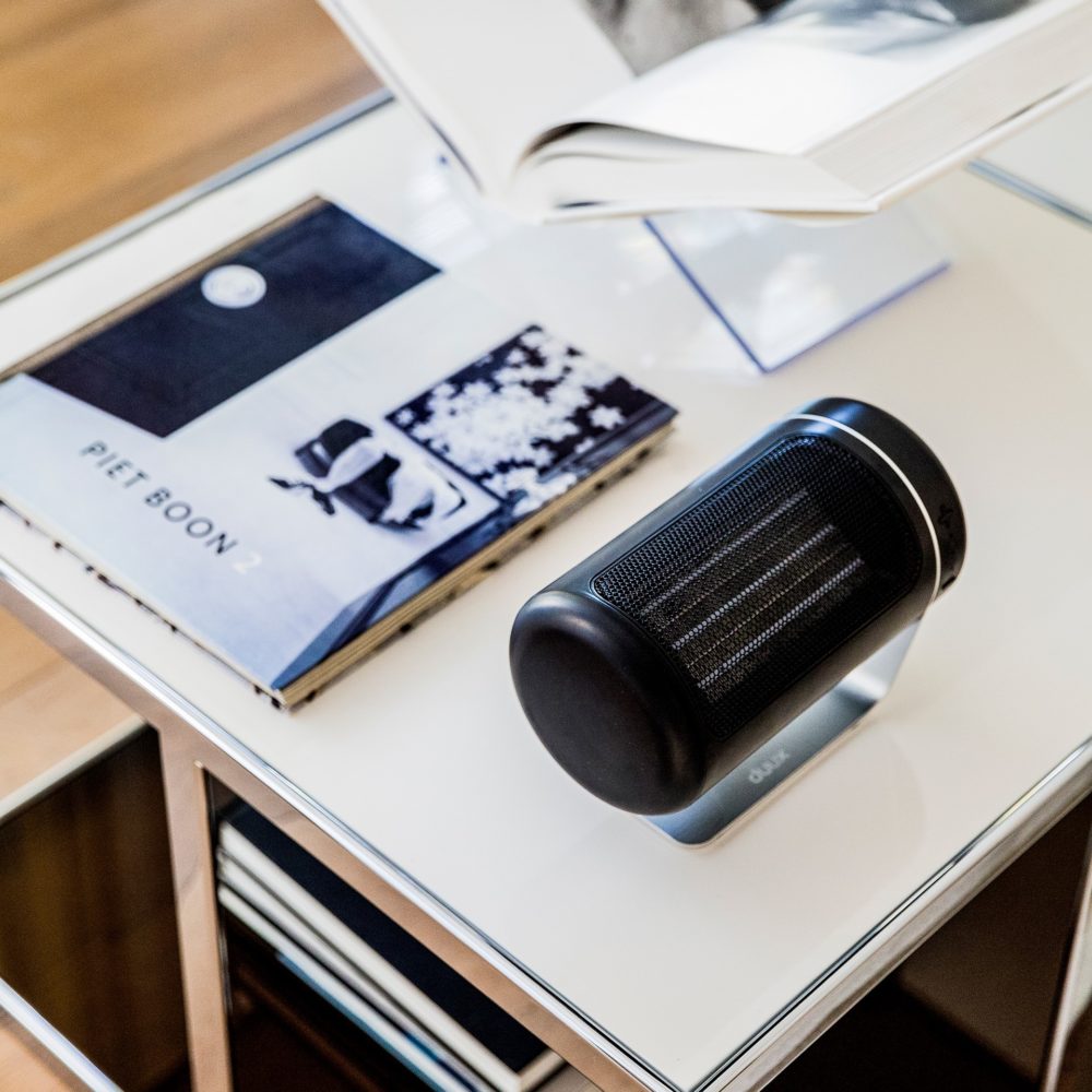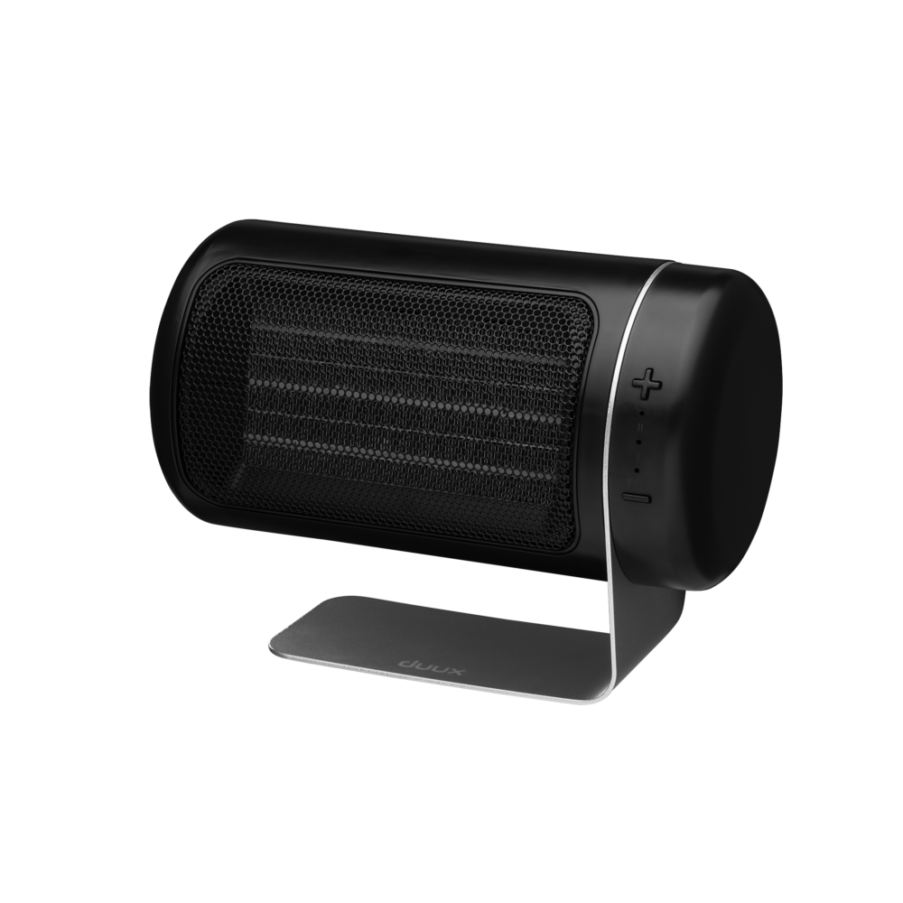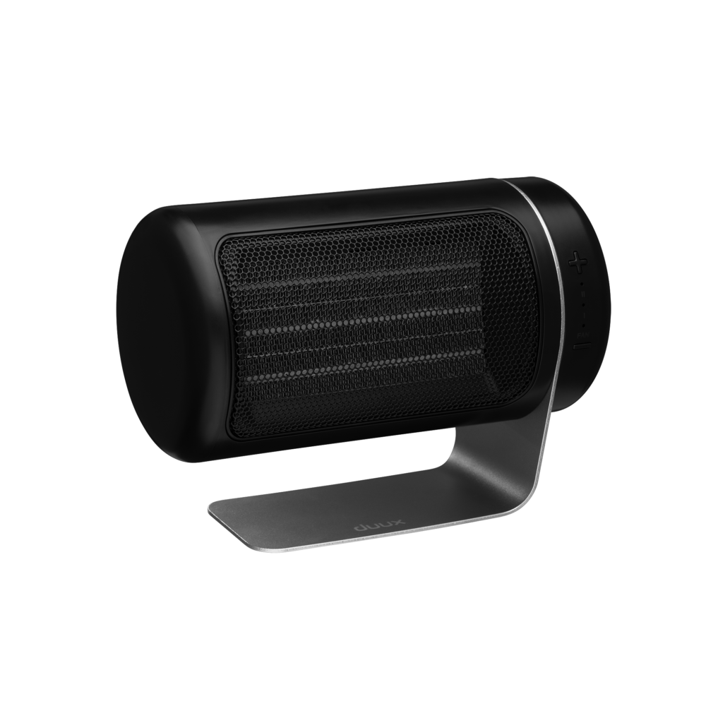 Met de dubbele DC-ventilator, naast elkaar geplaatst, is Twist keramische heater verrassend krachtig voor zijn compacte formaat. Door de verhoogde luchtstroom kan de warmte die door de keramische plaat wordt geproduceerd, verder in de ruimte worden verdeeld dan verwarming van vergelijkbare grootte met slechts één ventilator.