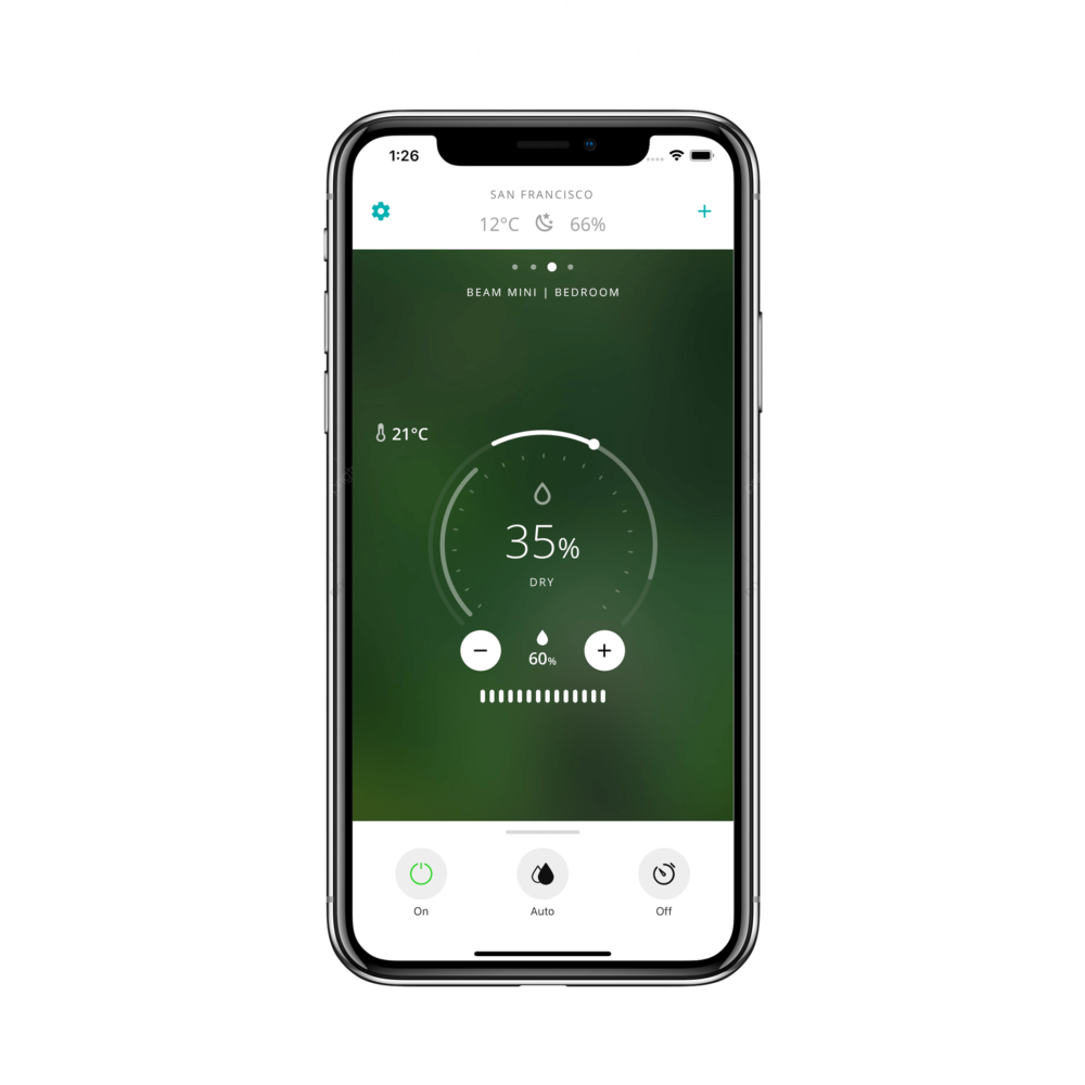 Met Beam Mini 2 heb je de touwtjes in handen: het hoge resolutie LED scherm toont alle informatie die je nodig hebt, inclusief instellingen en waarden zoals temperatuur en luchtvochtigheid. Met de losse afstandsbediening kan je Beam Mini 2 vanuit de hele kamer bedienen zonder op te staan uit je luie stoel of bank. Voor ultieme controle en bediening kun je gebruik maken van de gratis Duux-app met visuele interface.