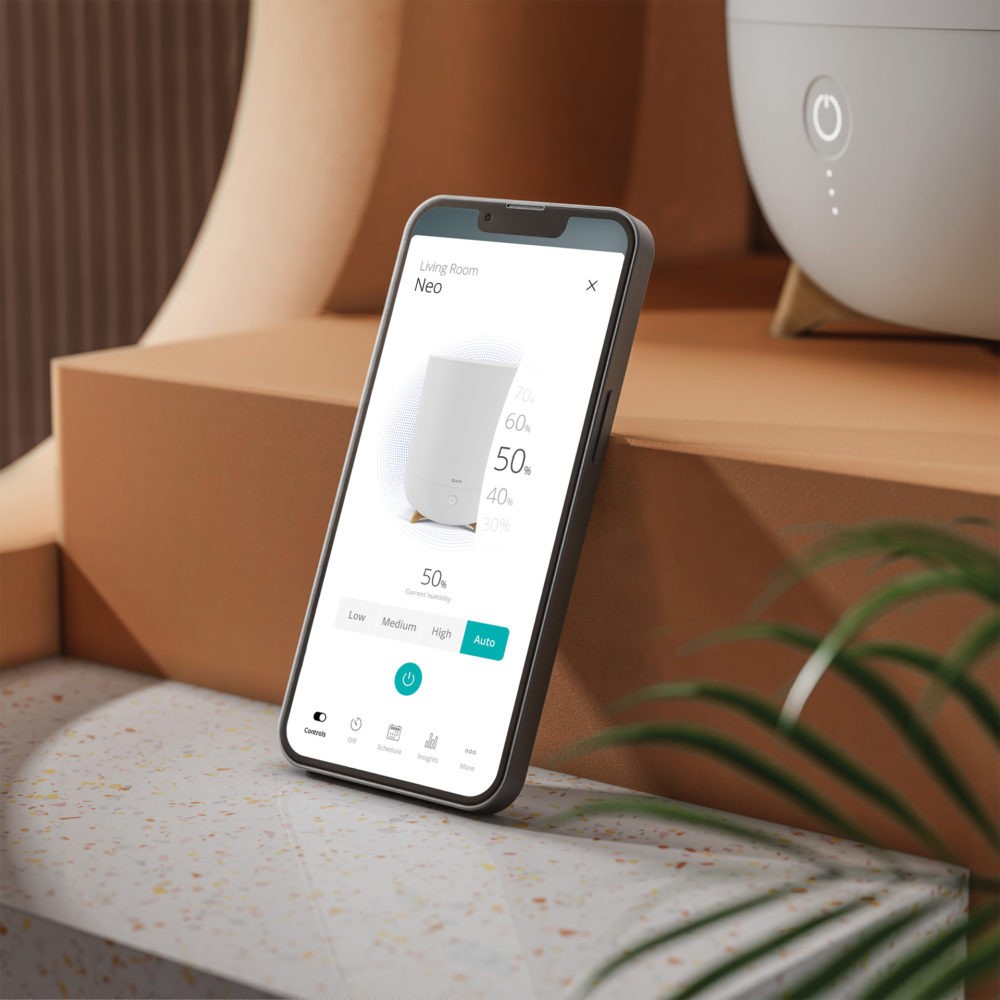 Met de volledig vernieuwde Duux-app neem je volledige controle over de luchtkwaliteit in huis. Stel de luchtvochtigheid in de kamer in op het gewenste comfortniveau of laat Neo de luchtvochtigheid automatisch voor je regelen met zijn ingebouwde hygrostaat.