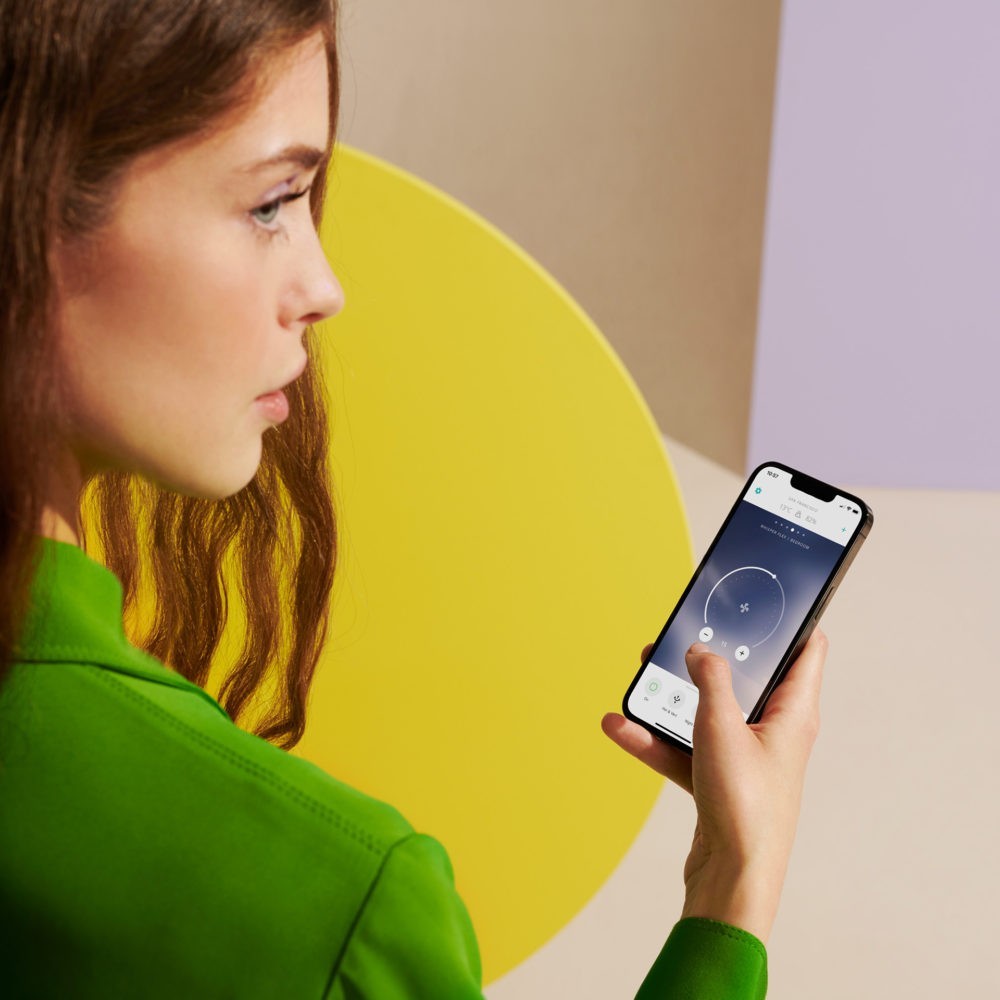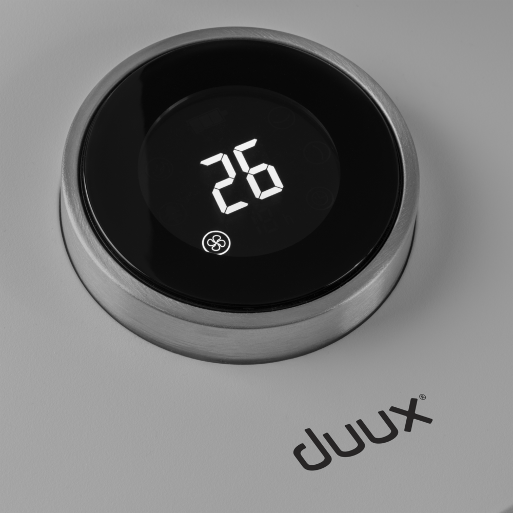 De Whisper Flex heeft tal van intuïtieve bedieningsopties, zoals de aluminium draaiknop en het hoge resolutie LCD-scherm in het midden van de interface. O ja, je hoeft niet op te staan: je bedient de Whisper Flex gewoon met de Duux smartphone app of afstandsbediening, die achterop het apparaat magnetisch vastklikt.