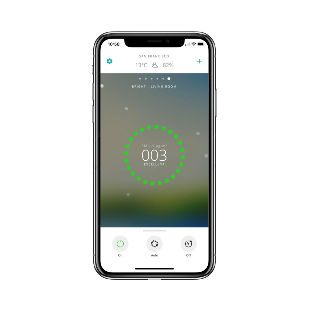 Dankzij de filter, bestaande uit een Pre-filter, HEPA H13-filter en actief koolstoffilter, verwijdert Bright tot 99,97% van alle deeltjes luchtverontreiniging in kamers tot 27 m². De zeer efficiënte ingebouwde ionisator versnelt het reinigingsproces en zuivert de lucht van zelfs de kleinste stofdeeltjes, chemicaliën, verontreinigende stoffen en allergenen. Dankzij de automatische modus en drie handmatige snelheidsinstellingen zijn meerdere luchtverversingen per uur (ACH) mogelijk, waardoor het apparaat een grote impact heeft met een kleine voetafdruk.